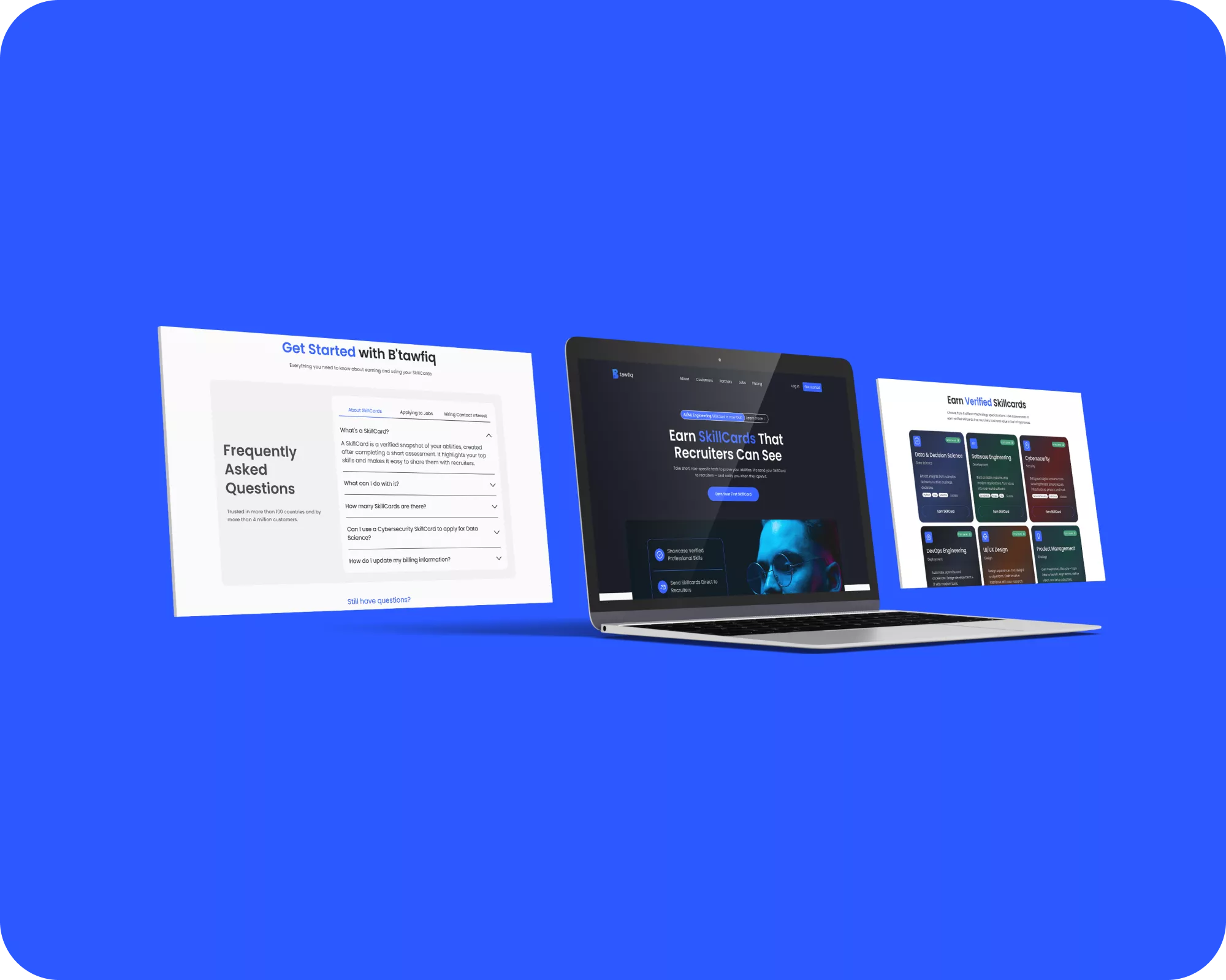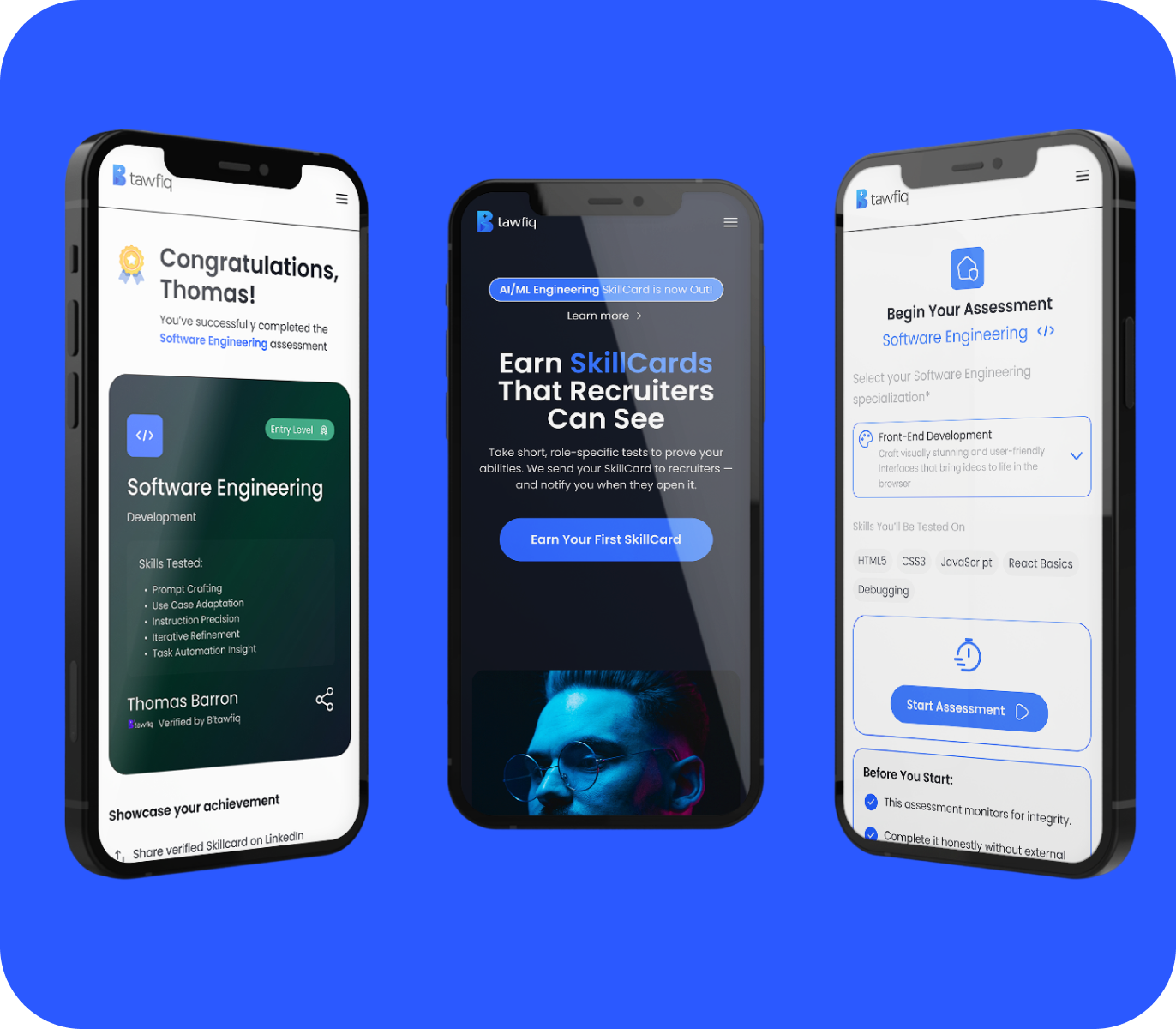 The final product delivers an empowering user experience that makes learning, testing, and career growth feel interconnected and rewarding.Through strategic UX flow, accessible UI components, and a confident visual language, B’Tawfiq now stands as a reliable platform where users can validate their abilities and use their digital skillcards to access better job opportunities.