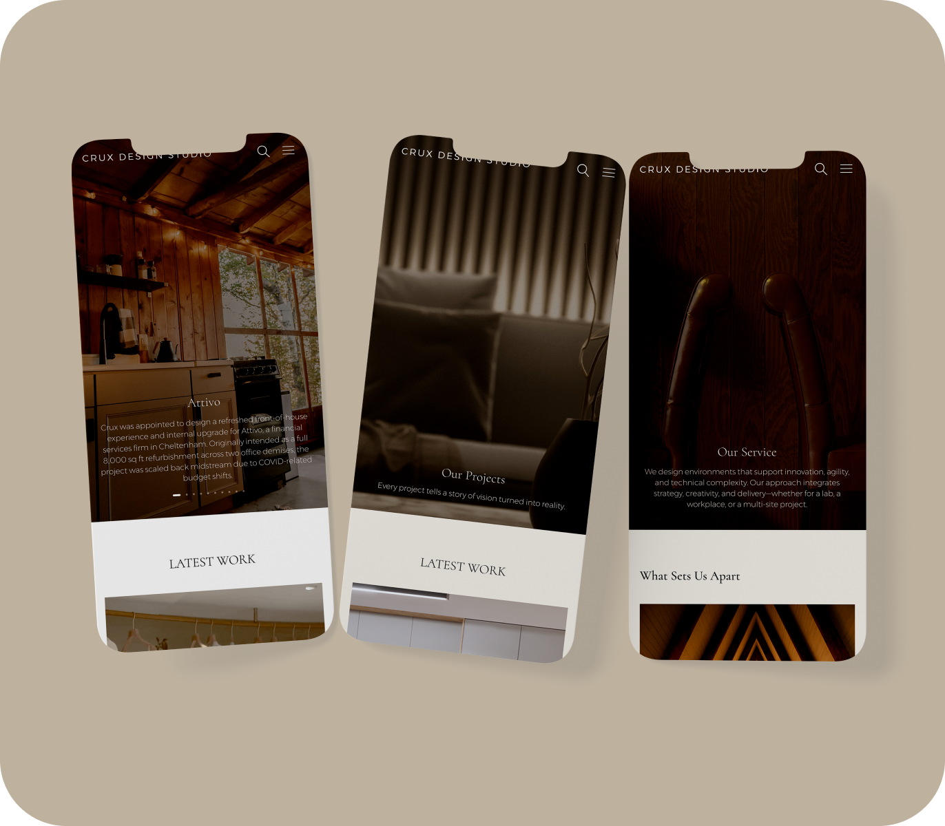 The final result is a sleek, visually immersive website that encapsulates Crux Design Studio’s identity; modern, luxurious, and deeply artistic. Through the use of neutral palettes, balanced white space, and precise typography and layout, we created a platform that not only presents the studio’s work but extends its aesthetic philosophy into the digital space; an experience that feels as refined as the interiors it represents.